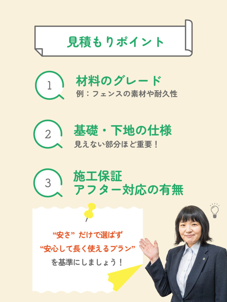 大事なのは「何が含まれていて、どんな材料・施工方法なのか」を確認することです。