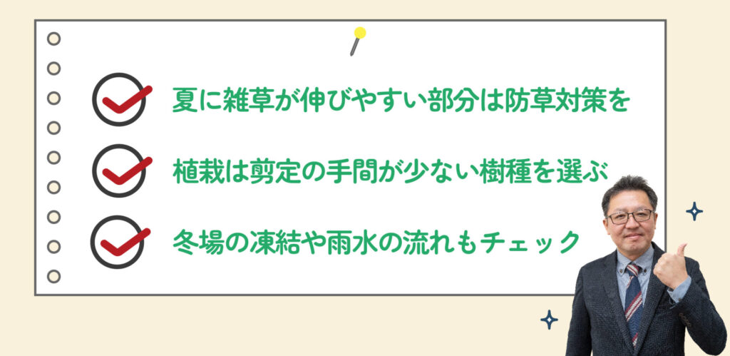 たとえば「おしゃれにしたかったのに、思ったよりメンテナンスが大変」など。→まずは家族で「何を一番改善したいか」を話し合っておくことが大切です。