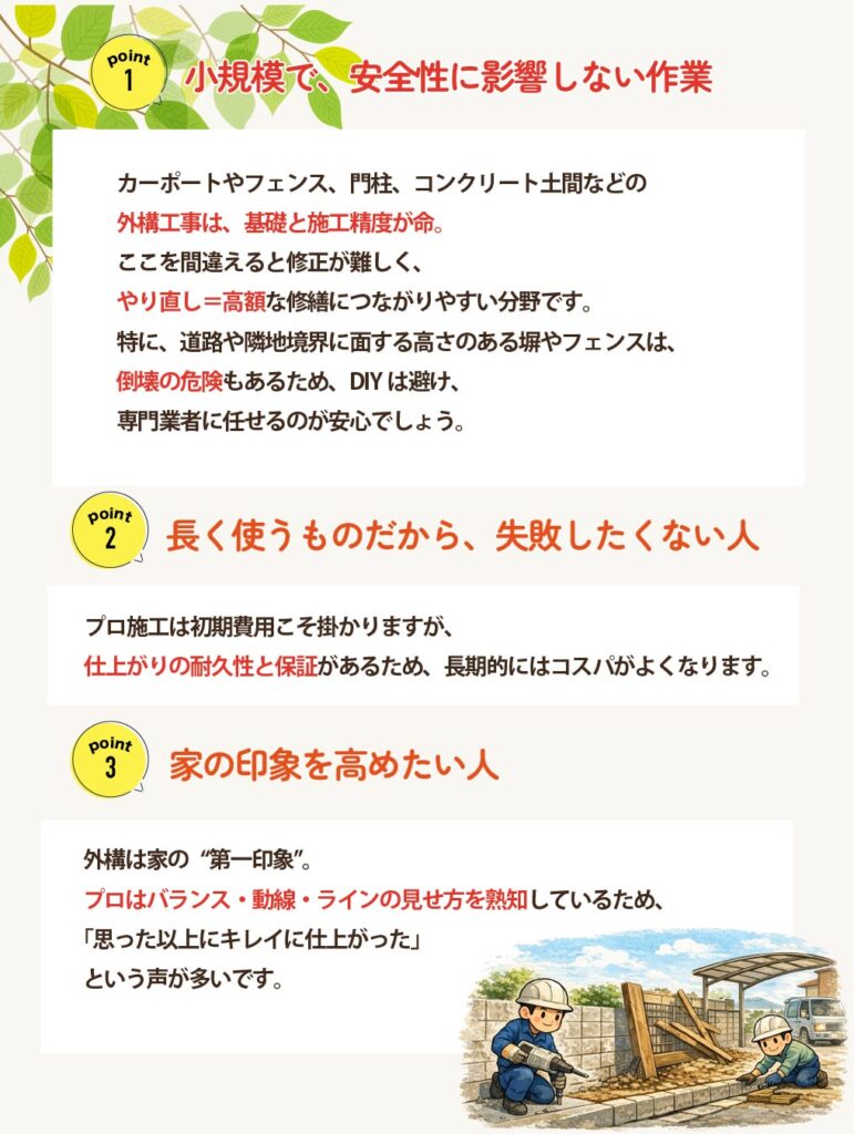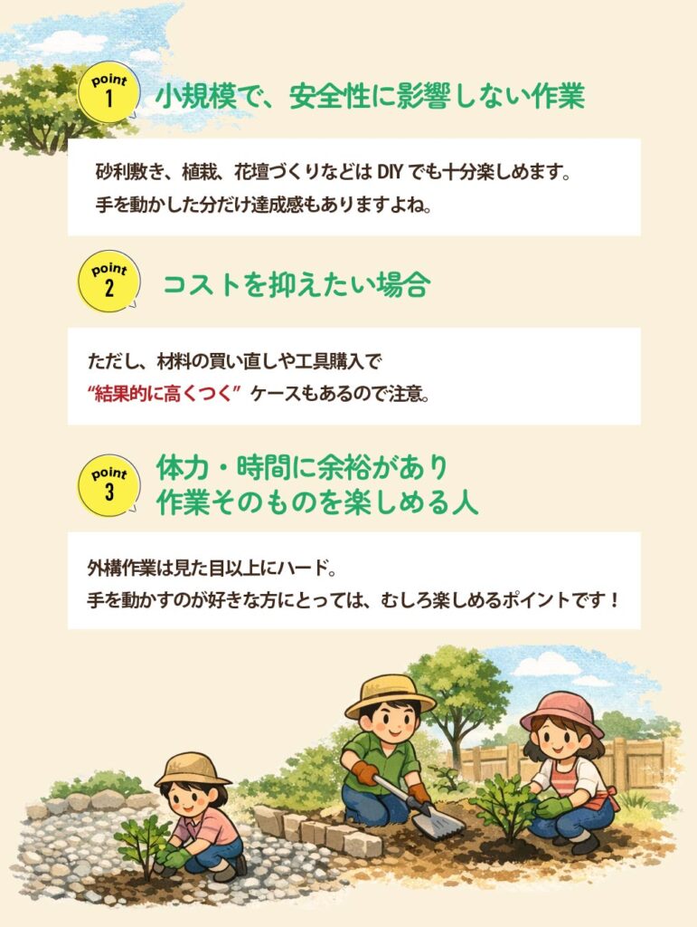 外構工事を検討するとき、多くの方が一度は悩むテーマが「DIYでやるか、プロに頼むか」