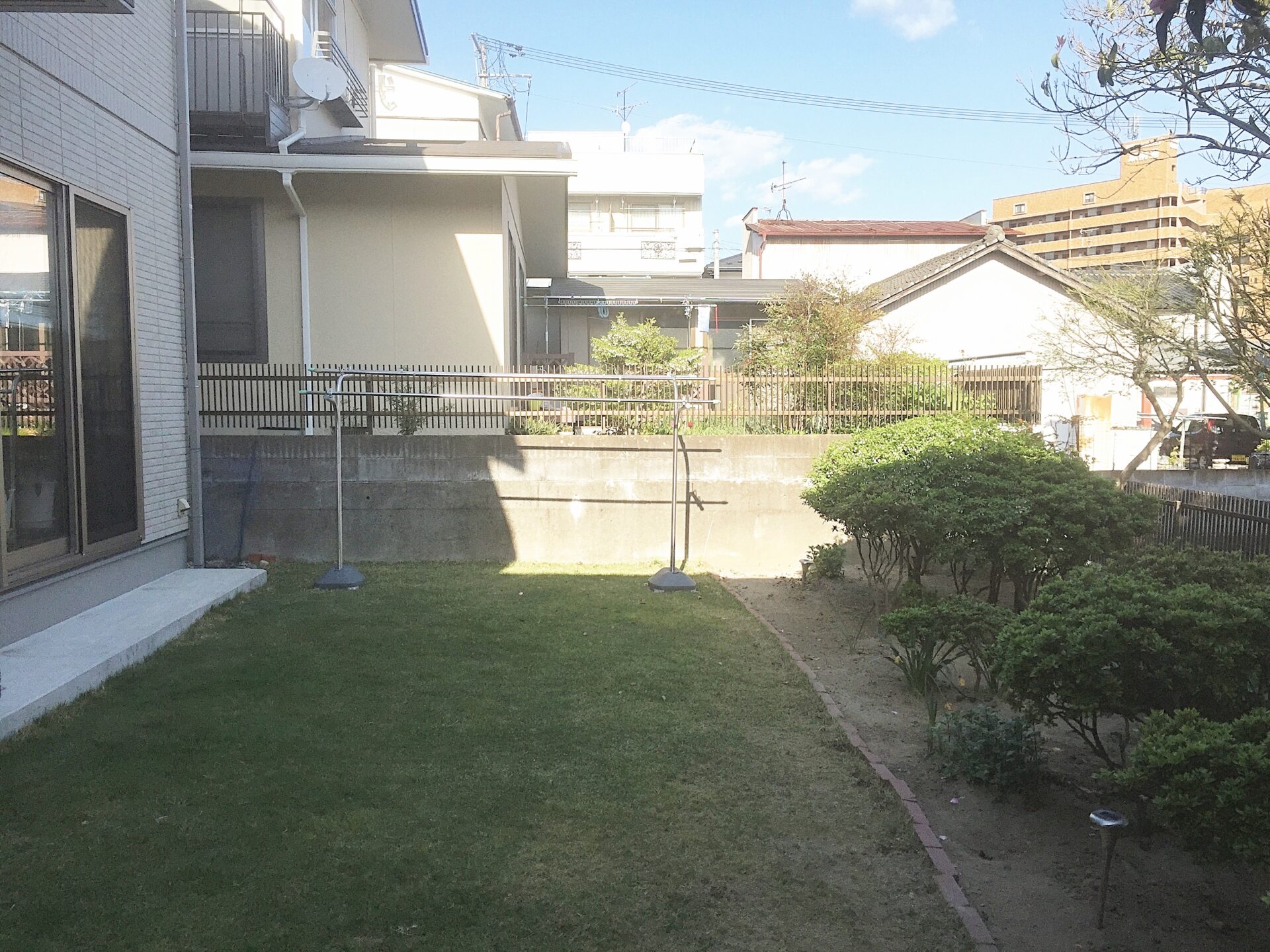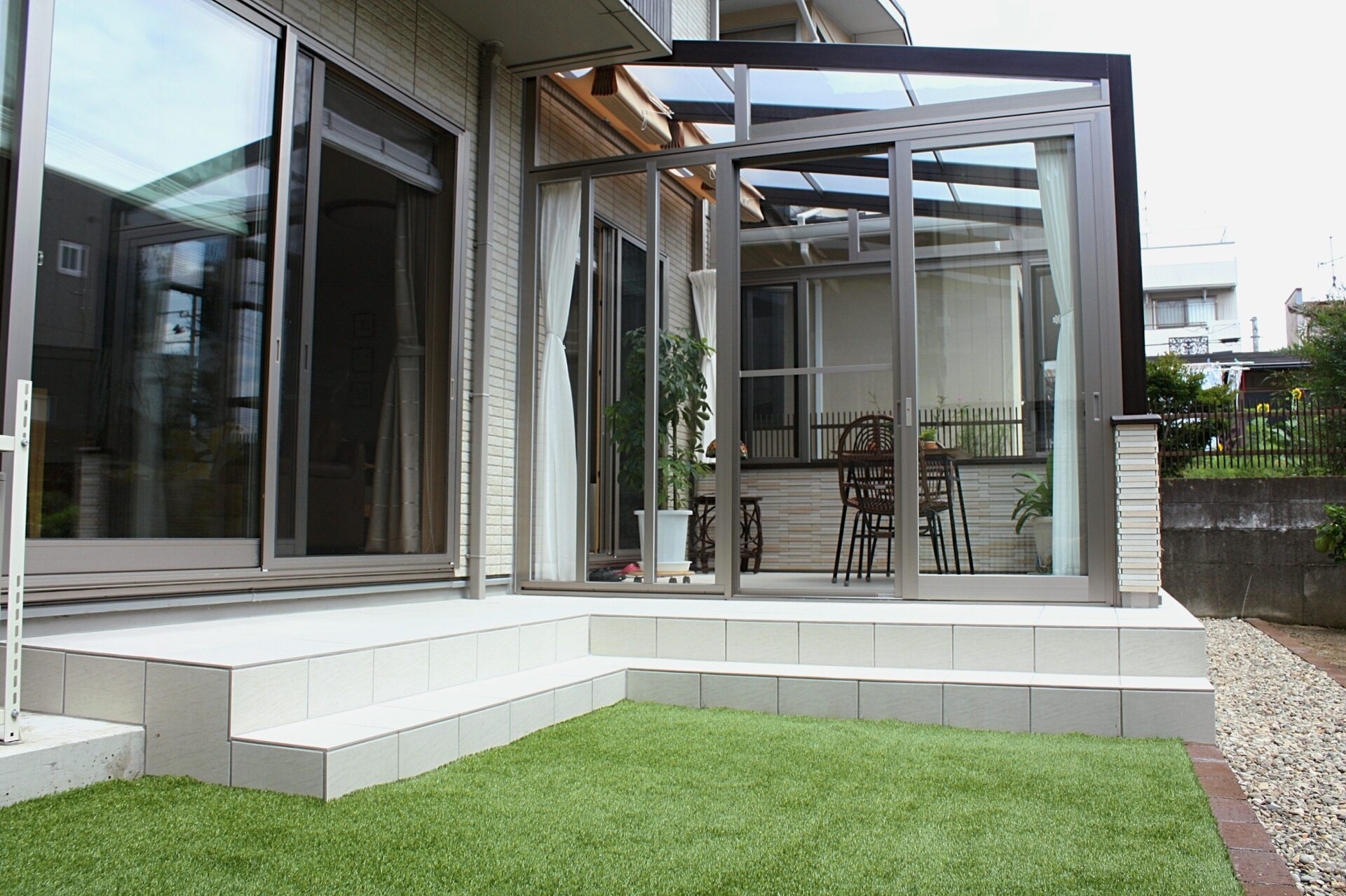 リビング前にはLIXILのココマ(ガーデンルームタイプ)を設置させて頂きました。ココマはL型腰壁。ガーデンルームの床はタイル仕上げ。天然芝を剥がし、人工芝へ。