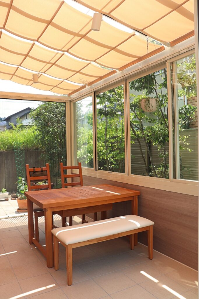 オプションの内部日除けは必須アイテムです。夏の強い日差しをカット。垂木にレールタイプの照明器具を取り付け、夜も使用できるようにしました。