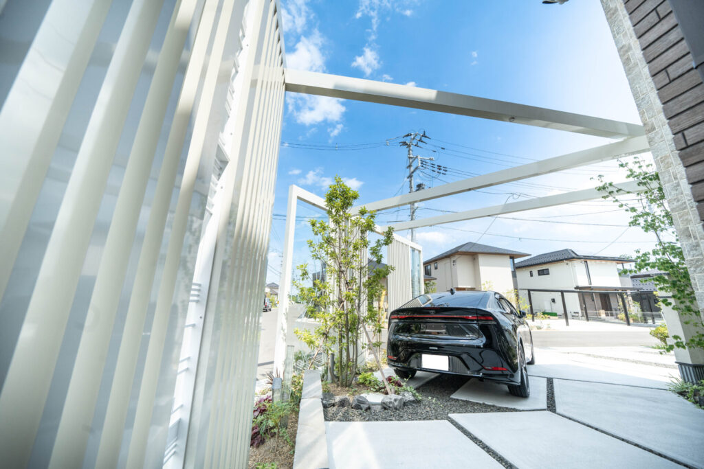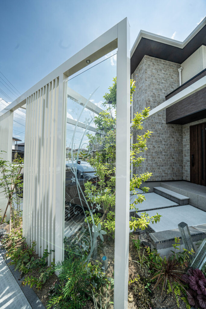 Gフレームをクロスに設置し、道路側はデザイン格子で程よく目隠し。Gフレームにはダウンライトを仕込み、夜の演出にもこだわりを。