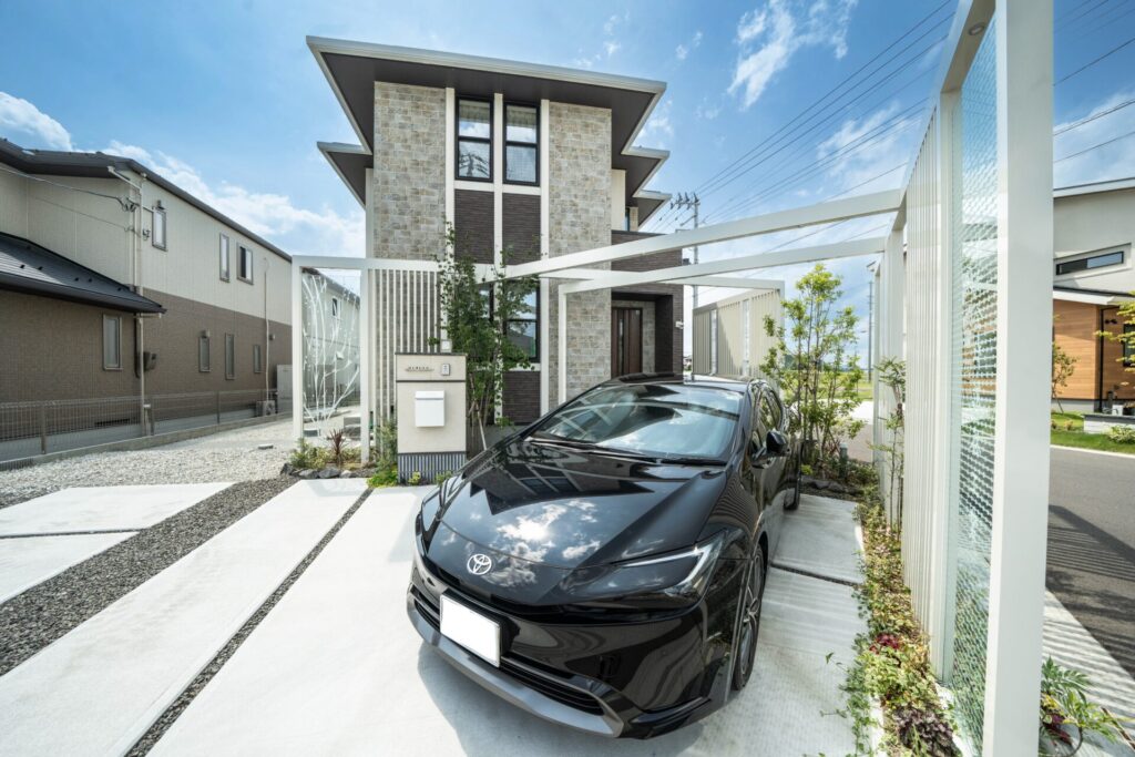宮城県 K様邸 LIXILのプラスGを使用したエクステリア。白を基調としたフレームとEXALIVEのダイナミックガラス、インゴットを使用したガラスが印象的なエクステリアです。